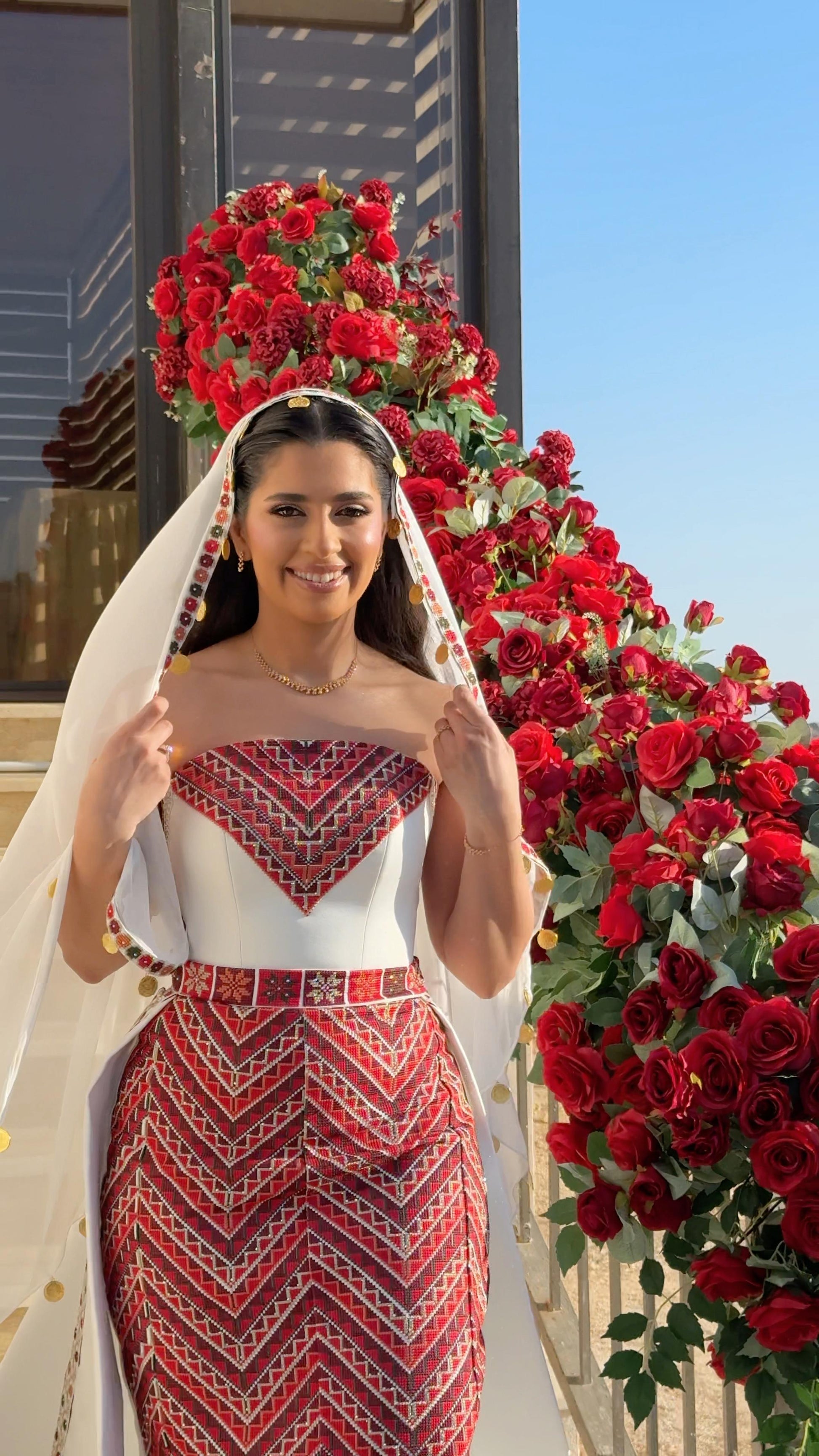 Plestia Alaqad, Award Winning Journalist and Author, wearing BySaraD Fashion House custom-made blazer with Palestinian embroidery.